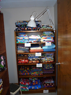 I worked several more hours. I took a lot of the fabric off the cardboard holders because I felt I could fit more fabric on a shelf without them; I refolded several pieces (yardage) of the fabric because whoever had them before folded them inside out (?); started stacking the shelves; cut a couple more pillowcases (just because).....